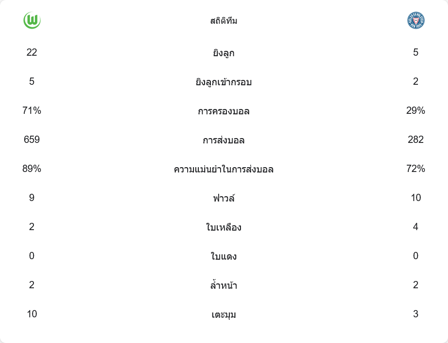 โวล์ฟสบวร์กครองบอลมากถึง 71% เทียบกับ 29% ของโฮลสไตน์ คีล เจ้าบ้านมีโอกาสยิง 22 ครั้ง เข้ากรอบ 5 ครั้ง ขณะที่ทีมเยือนมีโอกาสยิงเพียง 5 ครั้ง แต่เข้ากรอบ 2 ครั้ง ความแม่นยำในการส่งบอลของโวล์ฟสบวร์กอยู่ที่ 89% ส่วนของคีลอยู่ที่ 72% เกมนี้มีการฟาวล์ทั้งหมด 19 ครั้ง โวล์ฟสบวร์กฟาวล์ 9 ครั้ง และ คีล ฟาวล์ 10 ครั้ง ใบเหลืองรวม 6 ใบ โดยเจ้าบ้านได้ 2 ใบ ส่วนทีมเยือนได้ 4 ใบ