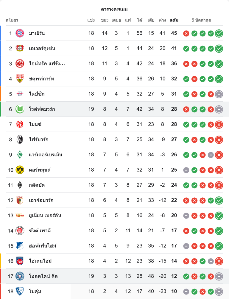 โวล์ฟสบวร์กยังคงอยู่ที่ อันดับ 6 มี 28 คะแนน จาก 19 นัด ส่วนโฮลสไตน์ คีล อยู่ในโซนตกชั้นที่ อันดับ 17 มี 12 คะแนน จาก 19 นัด