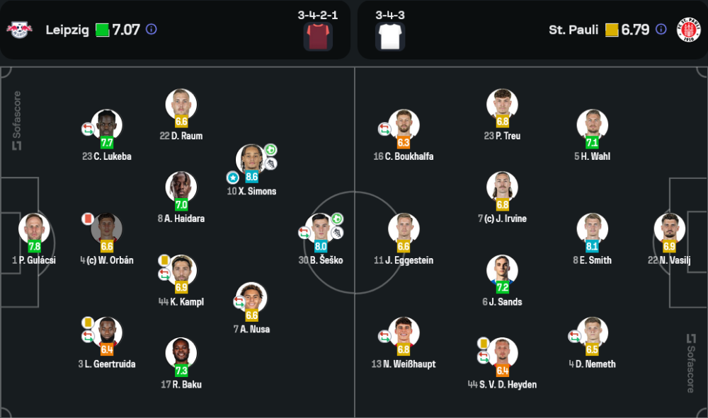 สถานการณ์ของซังค์ เพาลีย่ำแย่ลงไปอีกเมื่อ วิลลี่ ออร์บาน ของไลป์ซิกโดนใบแดงในนาทีที่ 69 หลังจากตัดเกมคู่แข่งแบบน่าเกลียด ทำให้ทีมเหลือผู้เล่น 10 คน แต่ถึงแม้ทีมเยือนจะได้เปรียบตัวผู้เล่น พวกเขากลับไม่สามารถเจาะแนวรับของไลป์ซิกได้ จบเกม แอร์เบ ไลป์ซิก ชนะ ซังค์ เพาลี 2-0 เก็บสามแต้มสำคัญ