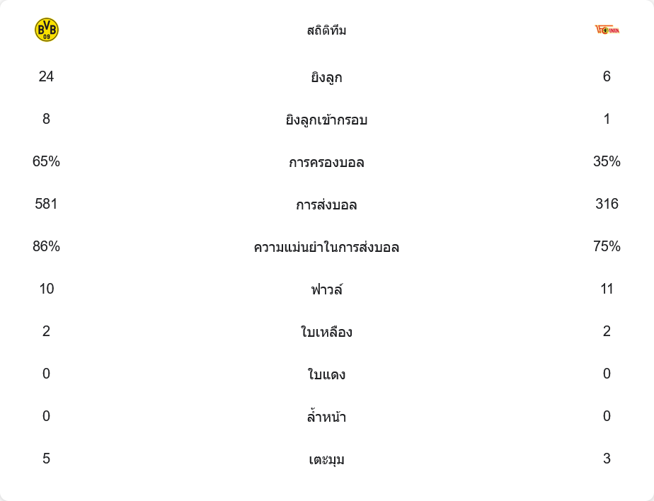 เกมนี้ โบรุสเซีย ดอร์ทมุนด์ ครองเกมได้เหนือกว่าทุกมิติ พวกเขามีอัตราครองบอลสูงถึง 65% เทียบกับ ยูเนี่ยน เบอร์ลิน ที่ทำได้เพียง 35% ตลอดทั้งเกม เจ้าบ้านเดินหน้าบุกอย่างต่อเนื่องและสร้างโอกาสยิงได้มากถึง 24 ครั้ง โดย 8 ครั้ง ตรงกรอบ ขณะที่ยูเนี่ยนมีโอกาสยิงเพียง 6 ครั้ง และตรงกรอบแค่ 1 ครั้ง ซึ่งแสดงให้เห็นถึงการขาดประสิทธิภาพในเกมรุกของทีมเยือน