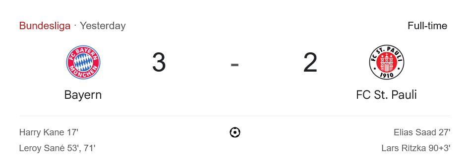 ช่วงท้ายเกม นาทีที่ 90+3 ลาร์ส ริตซ์ก้า ของ ซังค์ เพาลี ทำประตูปลอบใจได้สำเร็จ แต่ก็สายเกินไปสำหรับการกลับมา จบเกม บาเยิร์น มิวนิค เอาชนะ ซังค์ เพาลี ไปด้วยสกอร์ 3-2 คว้า 3 คะแนน สำคัญไว้ได้อย่างยอดเยี่ยม