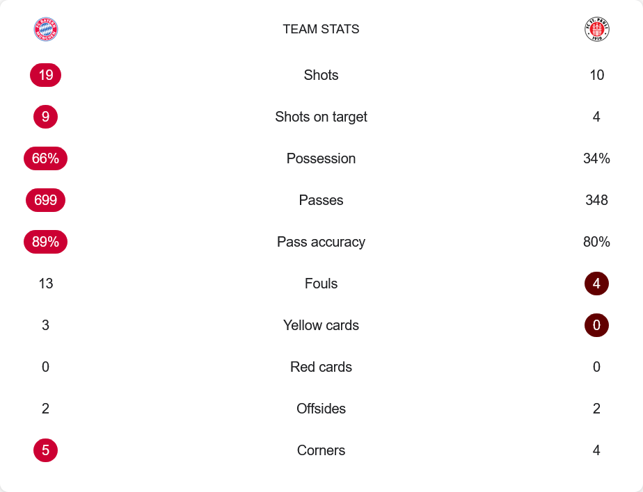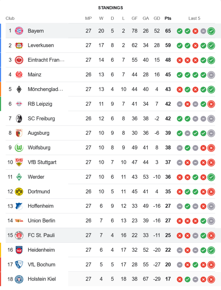 ชัยชนะครั้งนี้ทำให้ บาเยิร์น มิวนิค เก็บเพิ่มเป็น 65 คะแนน จาก 27 นัด ยังคงครองตำแหน่งจ่าฝูงอย่างเหนียวแน่น ทิ้งห่าง เลเวอร์คูเซ่น ที่มี 59 คะแนน อยู่ 6 คะแนน ขณะที่ ซังค์ เพาลี ยังคงต้องดิ้นรนเพื่อหนีตกชั้น โดยมีเพียง 25 คะแนน รั้งอันดับที่ 15 ของตาราง
