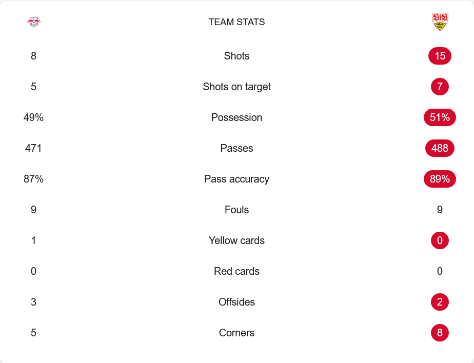 แม้ไลป์ซิกจะได้เล่นในบ้านและครองบอล 49% พร้อมกับมีโอกาสยิงทั้งหมด 8 ครั้ง และเข้ากรอบ 5 ครั้ง แต่กลับไม่สามารถรักษาสกอร์นำไว้ได้ ขณะที่สตุ๊ตการ์ตครองบอล 51% และแสดงความเฉียบขาดเหนือชั้นเมื่อยิงได้ 15 ครั้งและเข้ากรอบถึง 7 ครั้ง การจ่ายบอลของทีมเยือนแม่นยำกว่าชัดเจนที่ 89% จากจำนวน 488 ครั้ง ขณะที่ไลป์ซิกจ่ายไป 471 ครั้งที่ความแม่นยำ 87% ทั้งสองทีมมีจำนวนฟาวล์เท่ากันที่ 9 ครั้ง แต่ไลป์ซิกได้ใบเหลืองหนึ่งใบจาก โกมิส และเสียลูกเตะมุม 5 ครั้งให้ทีมเยือนที่ได้ถึง 8 มุม
