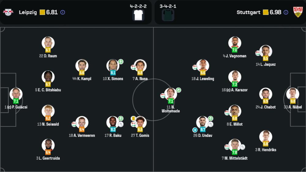 ไลป์ซิกยึดระบบ 4-2-2-2 มุ่งเน้นความคล่องตัวและการเปิดพื้นที่จากด้านข้างด้วยปีกเร็วอย่าง นูซา และ บากู ที่ครึ่งแรกถือว่าโดดเด่น แต่ขาดความแน่นอนในครึ่งหลัง โดยเฉพาะการตัดบอลแดนกลางที่เสียบ่อย ทำให้เกมสวนกลับของสตุ๊ตการ์ตอันตรายทันที