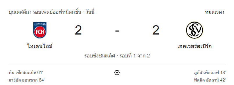 ไฮน์เดนเฮลม์รอดพ้นจากความพ่ายแพ้อย่างหวุดหวิด ด้วยการคืนชีพครึ่งหลังแบบสุดมันส์ ขณะที่เอลเวอร์สเบิร์กแม้จะนำก่อน 2-0 แต่ดันแผ่วในครึ่งหลังจนเสียโมเมนตัม เกมจบด้วยผลเสมอ 2-2 ทำให้ทุกอย่างต้องไปตัดสินกันในนัดที่สอง สาวกที่ตาม ผลบอลสด คู่นี้ได้เสพความมันส์เต็มอิ่มแน่นอน!