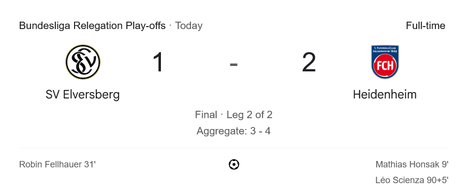 จากชัยชนะในนัดนี้ ไฮน์เดนเฮลม์พลิกสถานการณ์กลับมาเข้าวินด้วยสกอร์รวม 4-3 ทำให้พวกเขารอดพ้นการตกชั้นจากบุนเดสลีกาได้อย่างหวุดหวิด ส่วนเอลเวอร์เบิร์กต้องอกหัก แม้จะจบอันดับดีในลีกา 2 และมีโอกาสเลื่อนชั้น แต่กลับต้องอยู่ที่เดิมต่ออีกฤดูกาล
