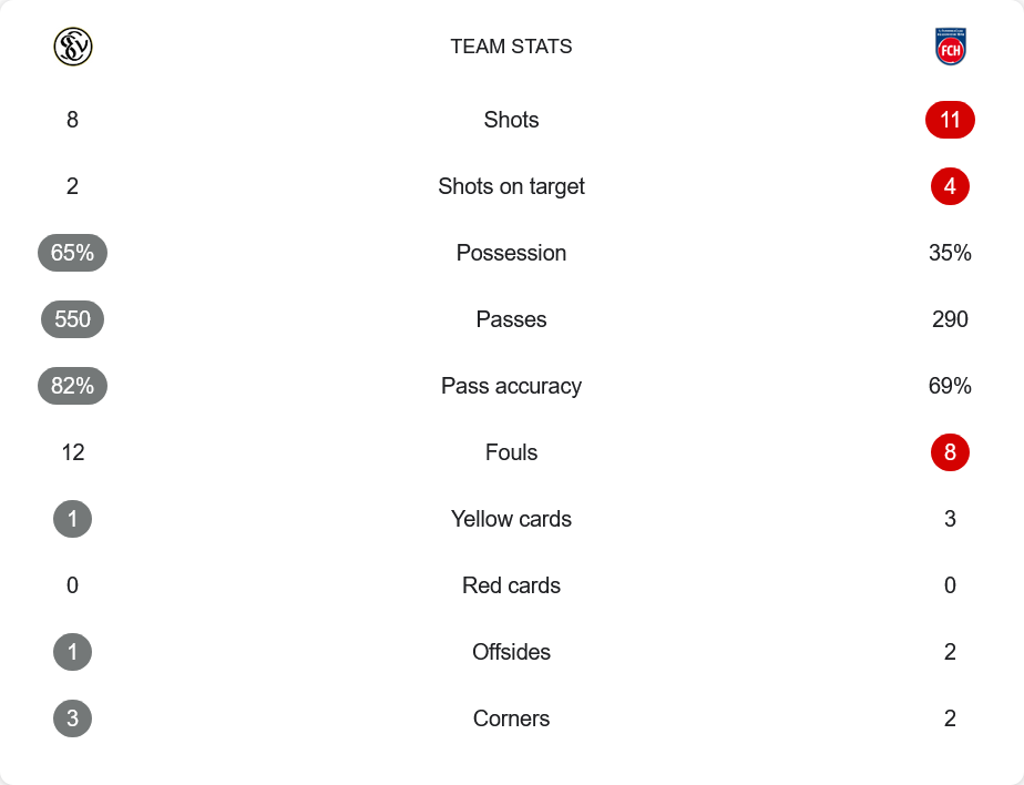 แม้เอลเวอร์เบิร์กจะเป็นฝ่ายครองบอลถึง 65% และผ่านบอลมากกว่าถึง 550 ครั้ง แต่พวกเขากลับยิงตรงกรอบเพียง 2 ครั้งเท่านั้นจากทั้งหมด 8 ครั้ง ขณะที่ไฮน์เดนเฮลม์แม้จะครองบอลน้อยเพียง 35% แต่กลับยิงตรงกรอบ 4 ครั้งจาก 11 ครั้ง ซึ่งกลายเป็นตัวแปรสำคัญของเกม ทีมเจ้าบ้านทำฟาวล์มากกว่าที่ 12 ครั้ง ส่วนทีมเยือนโดนใบเหลืองมากถึง 3 ใบ และได้เตะมุมแค่ 2 ครั้งเท่ากับเอลเวอร์เบิร์ก