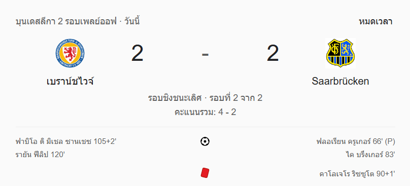- นาทีที่ 90+12: หมดเวลาปกติ Braunschweig 0-2 Saarbrücken ต้องต่อเวลาพิเศษ