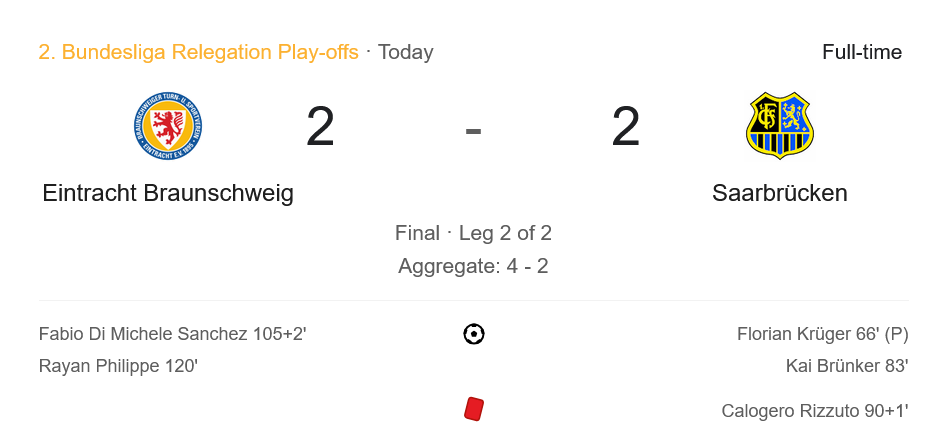 ผลการแข่งขันนี้ส่งให้ ไอน์ทรัค บราวน์ชไวก์ ยังคงอยู่รอดในศึกบุนเดสลีก้า 2 ต่อไป หลังคว้าชัยรวมสองนัดเหนือซาบรุคเค่นไป 4-2 ขณะที่ทีมเยือนต้องอกหักพลาดเลื่อนชั้นในรอบเพลย์ออฟอย่างน่าเสียดาย