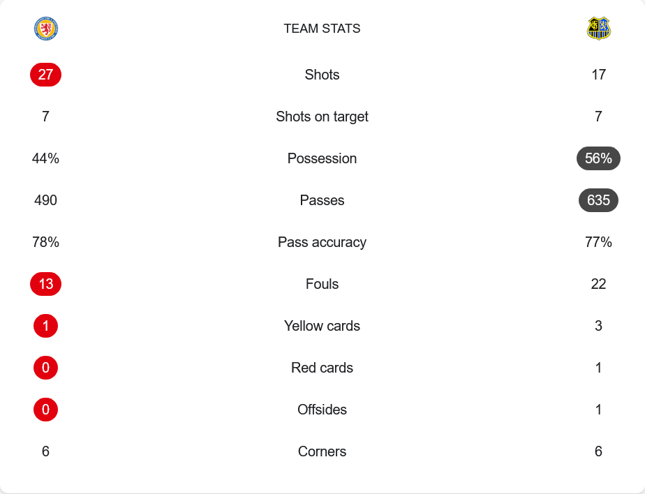 แม้ซาบรุคเค่นจะครองบอลมากกว่า 56% เทียบกับบราวน์ชไวก์ที่ 44% และผ่านบอลได้มากถึง 635 ครั้ง แต่ความแม่นยำในการจ่ายบอลของทั้งสองทีมไม่ต่างกันมาก (บราวน์ชไวก์ 78% / ซาบรุคเค่น 77%) อย่างไรก็ตาม บราวน์ชไวก์สร้างโอกาสยิงได้มากถึง 27 ครั้ง และตรงกรอบ 7 เท่ากับทีมเยือน เกมมีความดุเดือดเมื่อมีการฟาวล์รวมกันถึง 35 ครั้ง และจบด้วยใบเหลือง 4 ใบ รวมถึงใบแดงสำคัญของ ริซซูโต ที่เปลี่ยนโมเมนตัมเกมทั้งหมด