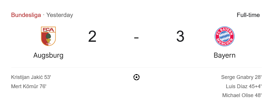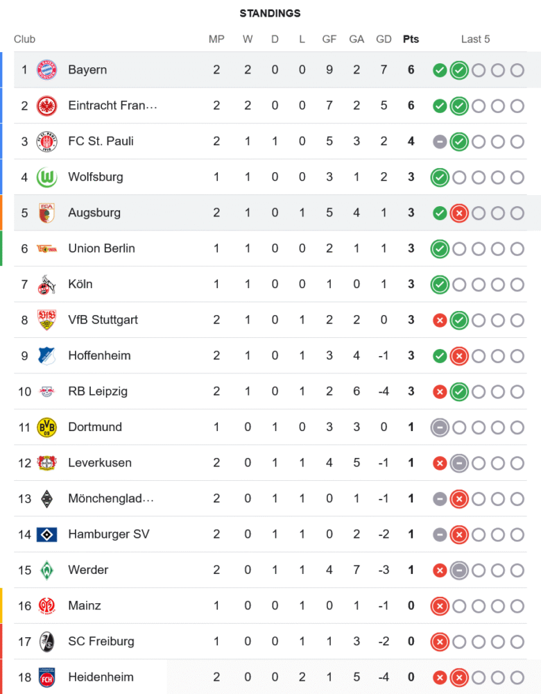 สามแต้มสำคัญทำให้ บาเยิร์น มิวนิค ขยับขึ้นรั้งจ่าฝูงของบุนเดสลีกา มี 6 คะแนนเต็มจากสองนัดแรก ส่วนเอาก์สบวร์กแพ้เกมนี้หล่นไปอยู่อันดับ 5 มี 4 คะแนน การลุ้นแชมป์ตั้งแต่ต้นฤดูกาลเริ่มเข้มข้นขึ้นทันที