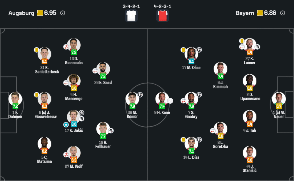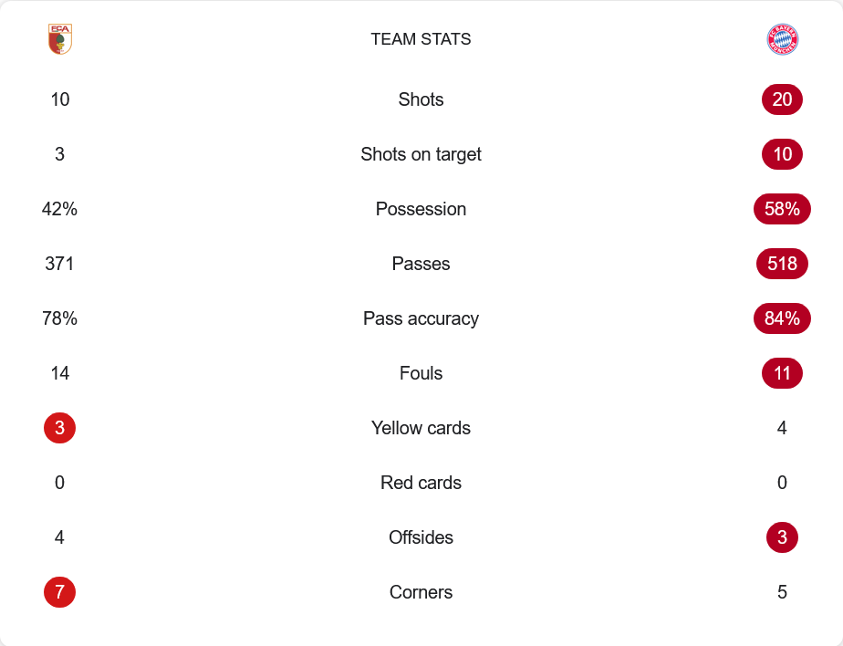 บาเยิร์นครองบอลเหนือกว่า 58% เทียบกับเอาก์สบวร์ก 42% ทีมเยือนสร้างโอกาสได้ 20 ครั้ง เข้ากรอบ 10 ส่วนเจ้าบ้านยิง 10 ครั้ง เข้ากรอบเพียง 3 บาเยิร์นจ่ายบอลแม่นยำถึง 84% รวม 518 ครั้ง ขณะที่เอาก์สบวร์กจ่าย 371 ครั้ง แม่นยำ 78% เกมนี้มีการฟาวล์รวมกันกว่า 25 ครั้ง ใบเหลืองออก 7 ใบ แสดงถึงความเข้มข้นดุดันตลอดทั้งแมตช์