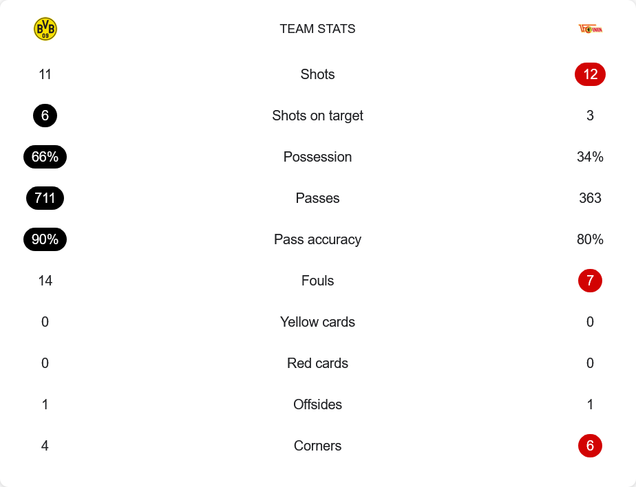 ตัวเลขชี้ชัดถึงความเหนือชั้นของเสือเหลือง ครองบอลถึง 66% ต่อ 34% ของยูเนี่ยน จ่ายบอล 711 ครั้ง ความแม่นยำสูงถึง 90% ขณะที่ทีมเยือนจ่ายเพียง 363 ครั้ง แม่นยำ 80% แม้ยูเนี่ยนยิงมากกว่า 12 ครั้งต่อ 11 แต่ยิงตรงกรอบเพียง 3 ครั้ง ขณะที่ดอร์ทมุนด์ยิงเข้ากรอบ 6 ครั้งและเปลี่ยนเป็น 3 ประตูเต็มๆ เกมนี้ฟาวล์ค่อนข้างเยอะรวม 21 ครั้ง แต่ไม่มีใบเหลืองหรือใบแดงออกมา เตะมุมยูเนี่ยนได้มากกว่า 6 ครั้ง แต่ไม่สามารถเปลี่ยนเป็นสกอร์ได้เลย