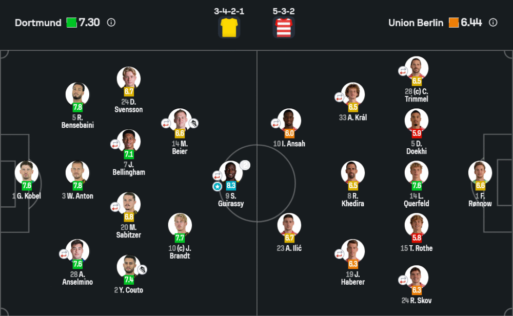 ยูเนี่ยน เบอร์ลินวาง 5-3-2 ถอยตั้งรับเต็มที่ พยายามบีบแคบและรอสวนกลับ จุดอ่อนคือเสียบอลแดนกลางง่าย ทำให้แนวรับโดนดอร์ทมุนด์ทะลวงซ้ำหลายครั้ง เชิง วิเคราะห์บอล เกมนี้เห็นชัดว่าดอร์ทมุนด์เหนือกว่าทั้งการครองจังหวะและการเข้าทำ ยูเนี่ยนจำเป็นต้องแก้เรื่องการประสานแดนกลางอย่างเร่งด่วน