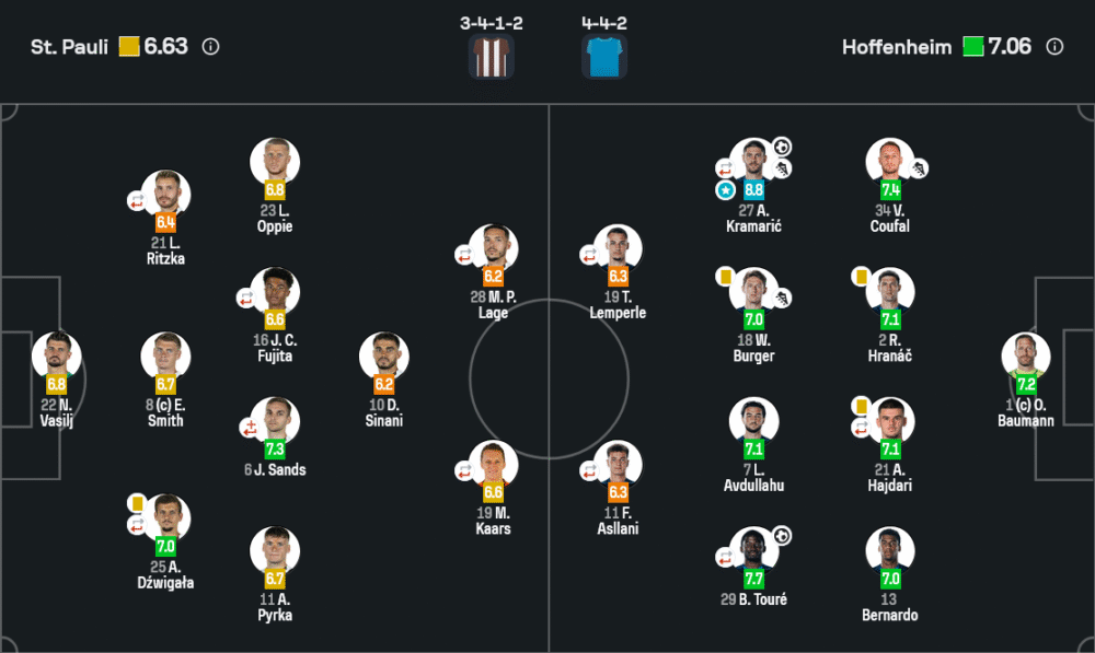 เกมนี้ชัดเจนว่า ฮอฟเฟนไฮม์ ใช้แผน 4-4-2 ที่ปรับเป็น 4-2-3-1 ตอนบุก เล่นเกมริมเส้นสองข้างได้อันตราย โดยมี ครามาริช เป็นจุดศูนย์กลางเชื่อมเกมกับตัวรุกริมเส้น การเคลื่อนบอลมีประสิทธิภาพสูง ทั้งความแม่นยำในการจ่ายและความเร็วในการเปลี่ยนจากรับเป็นรุก ในขณะที่ ซังค์ เพาลี ใช้แผน 3-4-1-2 พยายามตั้งรับแน่นแต่จุดอ่อนชัดที่แดนกลางแพ้เพรสซิ่ง ทำให้แนวรับโดนทะลวงอย่างต่อเนื่อง การเล่นสวนกลับยังขาดความคมและประสิทธิภาพเมื่อเทียบกับทีมเยือน บทสรุปจากการ วิเคราะห์บอล เกมนี้คือ เพาลีขาดการเชื่อมระหว่างกลางกับหน้า ส่วนฮอฟเฟนไฮม์คมชัดทั้งเกมรับและเกมรุก