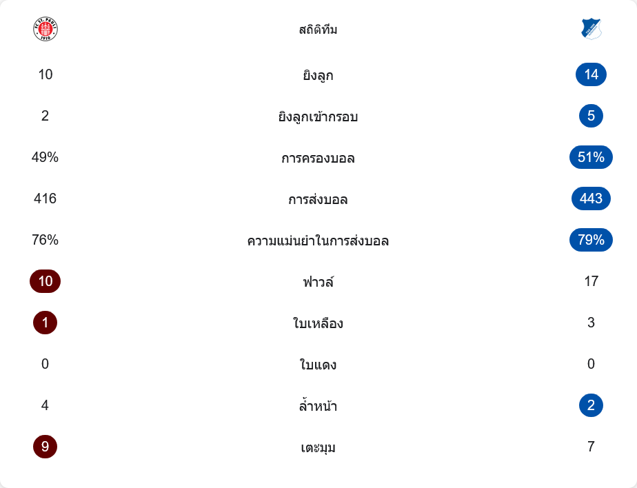 ตลอด 90 นาที ซังค์ เพาลี ยิง 10 ครั้ง เข้ากรอบเพียง 2 ขณะที่ ฮอฟเฟนไฮม์ ยิง 14 เข้ากรอบถึง 5 การครองบอลสูสี 49%-51% แต่ความแม่นยำในการจ่ายบอลทีมเยือนเหนือกว่าที่ 79% ต่อ 76% มีจังหวะล้ำหน้า 2 ครั้งและฟาวล์รวมกันถึง 27 ครั้ง เตะมุมทีมเจ้าบ้านมากกว่าเล็กน้อย 9 ต่อ 7 แต่ไม่สามารถเปลี่ยนเป็นสกอร์ได้