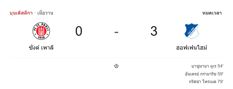 กลับมาครึ่งหลังนาที 54 แฟนบอลทีมเยือนเฮสนั่นสนาม เมื่อ ครามาริช จัดการซัดให้ ฮอฟเฟนไฮม์ ขึ้นนำ 1-0 ก่อนที่ วลาดิเมียร์ คูฟาล จะบวกเพิ่มในนาที 59 และจังหวะสุดท้าย นาที 79 กริชา โพรเมล ปิดกล่องซัดประตู 3-0 จบเกม ฮอฟเฟนไฮม์บุกยำใหญ่ใส่ ซังค์ เพาลี คว้าชัยไปอย่างงดงาม พร้อมโชว์ฟอร์มโหดสมกับศักยภาพในซีซั่นนี้