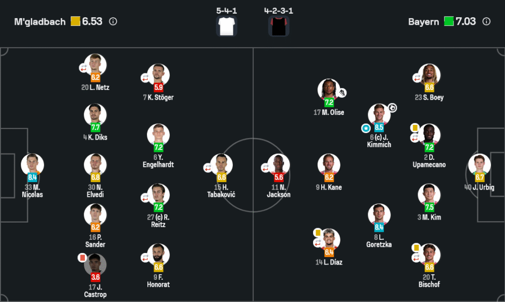 • กองหลัง: เซอร์จิโอ โบอี (6.6), ดาโยต์ อูปาเมกาโน่ (7.2), มิน-แจ คิม (7.5), ทิโม บิชอฟ (6.6)