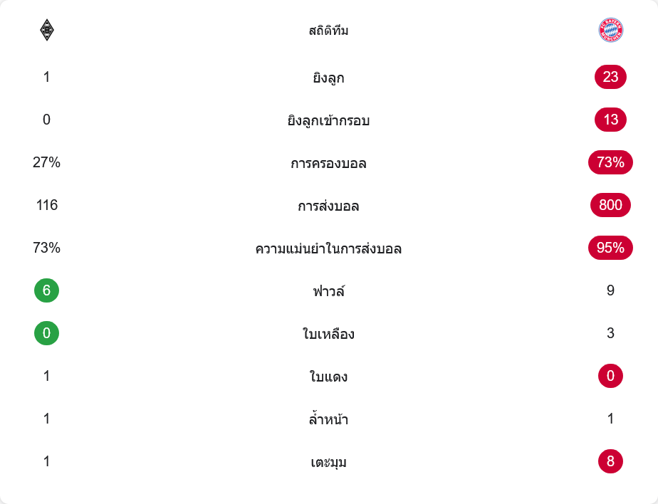 เกมนี้ บาเยิร์นครองบอลไปถึง 73% และยิงมากถึง 23 ครั้ง เข้ากรอบ 13 ครั้ง เทียบกับเจ้าบ้านที่ยิงเพียงครั้งเดียวทั้งเกม ความแม่นยำในการจ่ายบอลของทีมเยือนสูงถึง 95% จากจำนวนการผ่านบอลกว่า 800 ครั้ง ขณะที่เจ้าบ้านจ่ายได้เพียง 116 ครั้ง ความแตกต่างของตัวผู้เล่นและคุณภาพเชิงแท็กติกส่งผลให้รูปเกมเป็นของ “เสือใต้” แบบเบ็ดเสร็จเด็ดขาด กลัดบัคมีโอกาสเพียงลูกเตะมุมเดียวตลอดเกม ในขณะที่บาเยิร์นสร้างโอกาสได้ถึง 8 ลูกเตะมุม