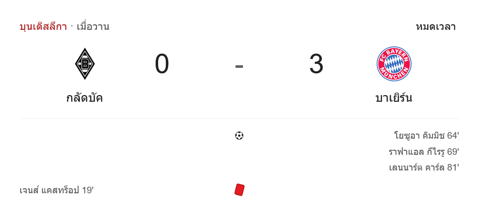 ศึก บุนเดสลีกา คืนนี้เป็นอีกหนึ่งเกมใหญ่ที่แฟนบอลทั่วโลกจับตา เมื่อ โบรุสเซีย มึนเช่นกลัดบัค เปิดบ้านรับการมาเยือนของ บาเยิร์น มิวนิค ซึ่งรูปเกมเริ่มต้นแบบสูสีในช่วง 15 นาทีแรก ก่อนที่สถานการณ์จะพลิกผันเร็วเมื่อ เจนส์ แคสทรอป โดนใบแดงไล่ออกตั้งแต่นาที 19 ส่งผลให้เจ้าถิ่นเหลือผู้เล่นเพียง 10 คนตั้งแต่ต้นเกม การที่กลัดบัคต้องเล่นเกมรับลึกตลอดทั้งครึ่งแรก ทำให้ บาเยิร์น ครองบอลบุกเข้าใส่อย่างหนัก แต่จังหวะสุดท้ายยังไม่คมพอ จบครึ่งแรกยังเสมอ 0-0 ท่ามกลางความกดดันมหาศาลของเจ้าบ้าน