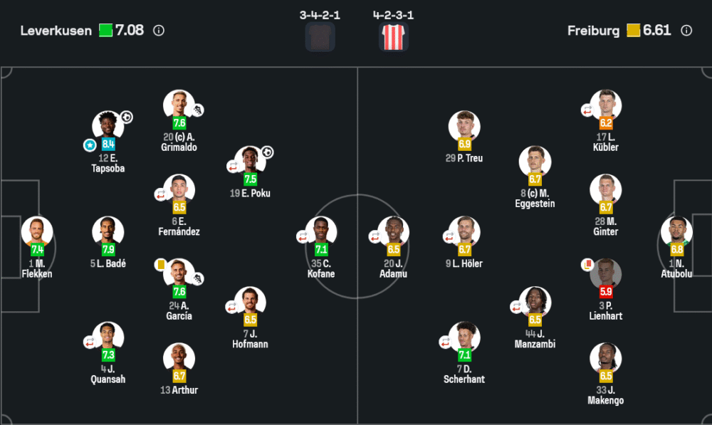 เอ๊ดม็องด์ ตาปโซบา (คะแนน 8.4) — เซ็นเตอร์ฮาล์ฟตัวเก่งของเลเวอร์คูเซินเล่นได้อย่างไร้ที่ติ ยิงประตูจากจุดโทษสำคัญและคุมเกมรับแบบอยู่หมัด ปิดพื้นที่ไม่ให้ไฟร์บวร์กเจาะเข้าเขตโทษได้ตลอดทั้งเกม สมราคา MOM อย่างแท้จริง