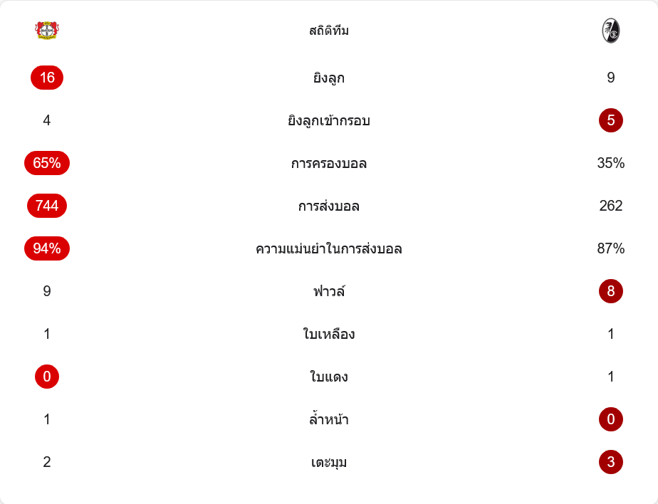 เลเวอร์คูเซินครองบอลมากถึง 65% เทียบกับไฟร์บวร์กเพียง 35% การส่งบอลของเจ้าบ้านทะลุ 744 ครั้ง ความแม่นยำ 94% ส่วนทีมเยือนส่งได้เพียง 262 ครั้ง ความแม่นยำ 87% แม้ไฟร์บวร์กจะมีโอกาสยิง 9 ครั้ง เข้ากรอบ 5 ครั้ง แต่ไม่สามารถเจาะแนวรับของเจ้าบ้านได้เลย ขณะที่เลเวอร์คูเซินยิง 16 ครั้ง เข้ากรอบ 4 ครั้ง แต่เป็นสองประตูสำคัญที่ตอกฝาโลงเกมนี้ได้เด็ดขาด