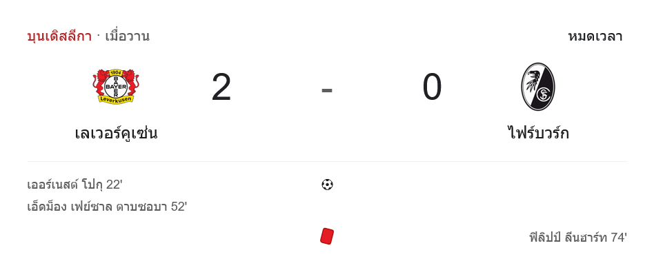 ศึกบุนเดสลีกาคืนวันอาทิตย์ที่ ไบอารีน่า เป็นการพบกันระหว่าง ไบเออร์ เลเวอร์คูเซิน เปิดบ้านรับการมาเยือนของ ไฟร์บวร์ก โดยเกมนี้เจ้าถิ่นของ กาสเปอร์ ฮูลมานด์ มาในฟอร์มสุดร้อนแรงตั้งแต่นาทีแรก กดดันทีมเยือนอย่างหนัก จนมาได้ประตูขึ้นนำ 1-0 ในนาทีที่ 22 จากจังหวะสุดเฉียบของ เออร์เนสต์ โปกู ที่หลุดไปซัดไม่พลาด ทำให้เสียงเฮของแฟนบอลเจ้าบ้านดังสนั่นทั่วสนาม เกมนี้จังหวะครองบอลของเลเวอร์คูเซินเหนือกว่าแบบชัดเจน เรียกได้ว่าเป็นฝั่งเดียวที่ได้ลุ้นต่อเนื่อง ด้าน ผลบอลสด ในครึ่งแรกจบที่เจ้าถิ่นนำ 1-0 อย่างสบายใจ