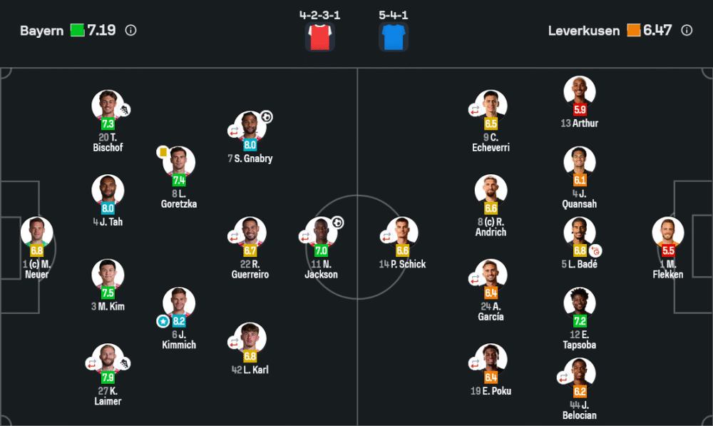• กองกลาง: โจชัว คิมมิช (8.2) ⭐, ลีออน โกเร็ตซ์ก้า (7.4), ราฟาแอล เกร์เรโร่ (6.7)