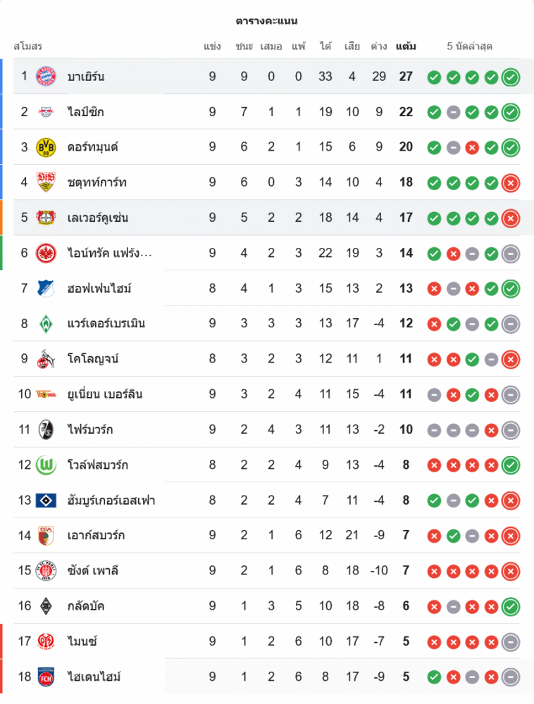หลังเกมนี้ บาเยิร์น มิวนิค เก็บ 27 แต้มเต็มจาก 9 นัด รั้งจ่าฝูงต่อเนื่อง และยังไม่แพ้ใครในซีซั่นนี้ ทิ้งห่าง ไลป์ซิก อันดับสองถึง 5 คะแนน ส่วน เลเวอร์คูเซิน พ่ายเป็นเกมที่สอง มีเพียง 17 แต้ม หล่นไปอยู่อันดับ 5 ของตาราง