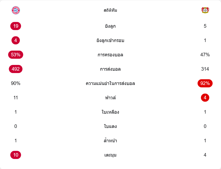 บาเยิร์น ครองบอลมากกว่า 53% ยิงรวม 19 ครั้ง เข้ากรอบ 4 ครั้ง ขณะที่เลเวอร์คูเซินมีโอกาสเพียง 5 ครั้งเท่านั้น การจ่ายบอลของเจ้าบ้านมากถึง 492 ครั้ง มีความแม่นยำถึง 90% แสดงให้เห็นถึงความนิ่งและประสิทธิภาพของทีม ส่วนทีมเยือนแม้จะมีเปอร์เซ็นต์ความแม่นยำ 92% แต่ไม่สามารถพาบอลขึ้นหน้าได้บ่อยเท่า จบด้วยการเสียเตะมุมถึง 10 ครั้ง และทำฟาวล์เพียง 4 ครั้งในเกม