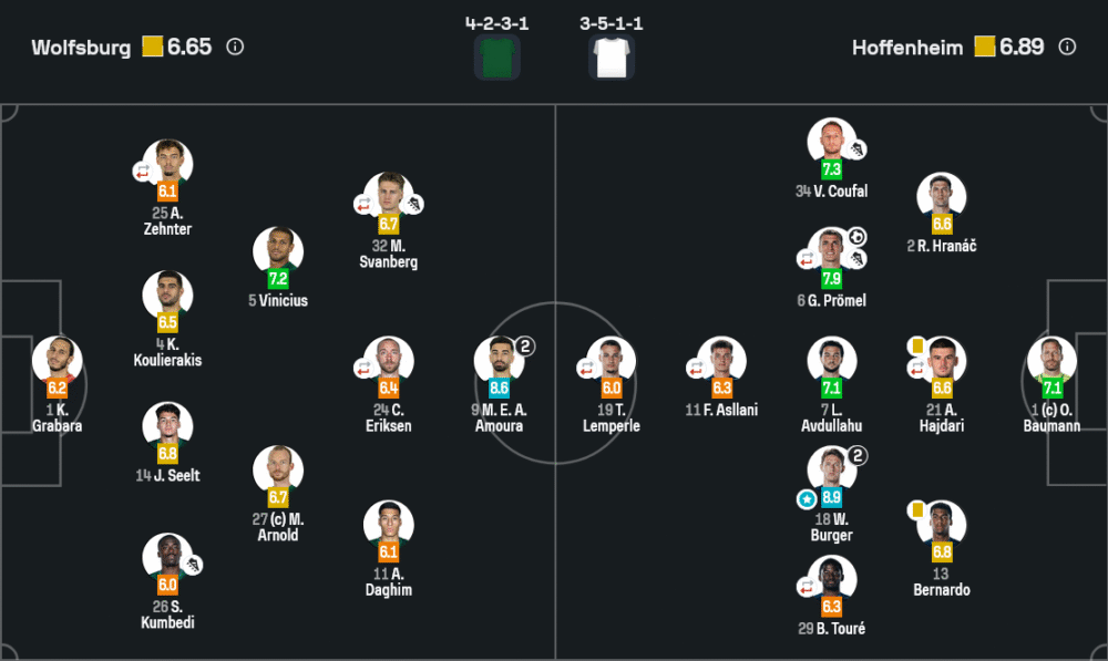 แต่ความเด็ดขาดของทีมเยือนกลับมาสู่เกมอีกครั้ง นาทีที่ 62 เบอร์เกอร์ ขึ้นโขกจากลูกเปิดของโพรเมิล เป็นประตูชัยพาฮอฟเฟนไฮม์บุกนำ 3-2 และแม้ช่วงท้ายเกม อิห์ลาส เบบู จะยิงเพิ่มได้อีกลูกแต่โดน VAR ยึดคืน จบเกม ฮอฟเฟนไฮม์ บุกซิวสามแต้มจากรังโวล์ฟสบวร์กไปอย่างสุดมัน