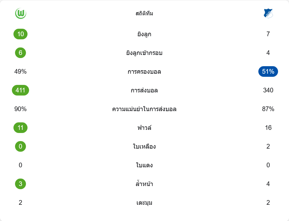 เกมนี้ทั้งสองทีมแทบไม่หนีกันในเรื่องการครองบอล โวล์ฟสบวร์ก 49% ส่วนฮอฟเฟนไฮม์ 51% เจ้าบ้านยิงรวม 10 ครั้ง เข้ากรอบ 6 ครั้ง ส่วนทีมเยือนยิง 7 ครั้ง เข้ากรอบ 4 ครั้ง ความแม่นยำในการส่งบอลของทั้งสองทีมอยู่ในระดับสูง โวล์ฟสบวร์ก 90% ส่วนฮอฟเฟนไฮม์ 87% เกมนี้เจ้าบ้านฟาวล์มากถึง 11 ครั้ง แต่ไม่มีใบเหลือง ส่วนทีมเยือนโดน 2 ใบ เตะมุมฝั่งละ 2 ถือเป็นเกมที่เปิดแลกกันแบบไม่มีใครยอมใคร