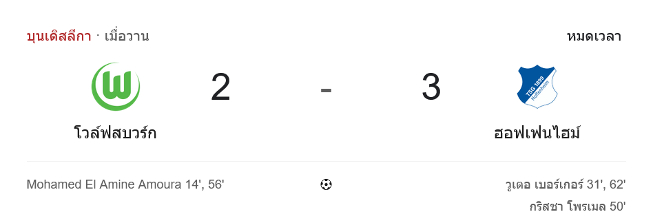 จาก : ผลบอลสด บุนเดสลีกา ระหว่าง โวล์ฟสบวร์ก 2-3 ทีเอสจี ฮอฟเฟนไฮม์ วันนี้ 2/11/68 – บ้านกีฬา