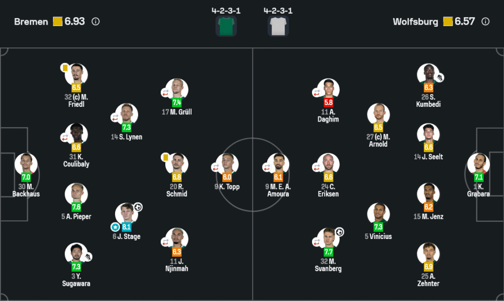 กองกลาง: เยนส์ สเตจ (8.1) ⭐, ซานเดอร์ ไลเนน (7.3), รามอน ชมิดท์ (6.8), มาร์โก กรึลล์ (7.4), จัสติน นีจ์มาห์ (6.3)