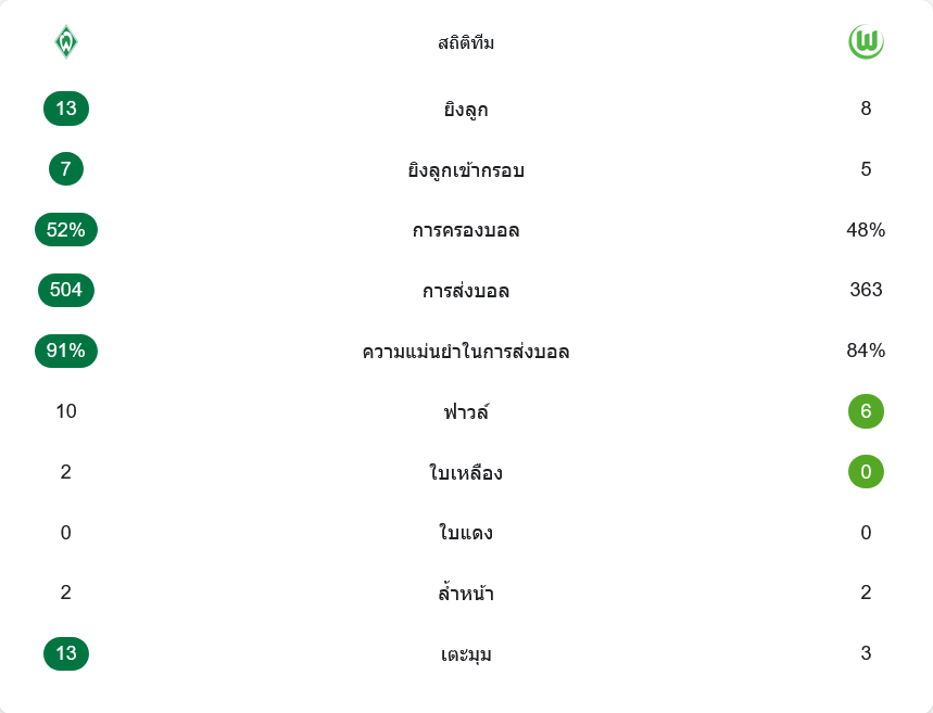 เจ้าบ้านยังได้ลูกเตะมุมมากถึง 13 ครั้ง เทียบกับเพียง 3 ของทีมเยือน แสดงให้เห็นถึงแรงกดดันในแนวรุกตลอดครึ่งหลัง ฝั่งโวล์ฟสบวร์กแม้เล่นคุมจังหวะดีในครึ่งแรก แต่การเสียบอลบ่อยและไม่สามารถปิดพื้นที่ปีกซ้ายได้ดีพอ ทำให้โดนเจาะในช่วงท้าย