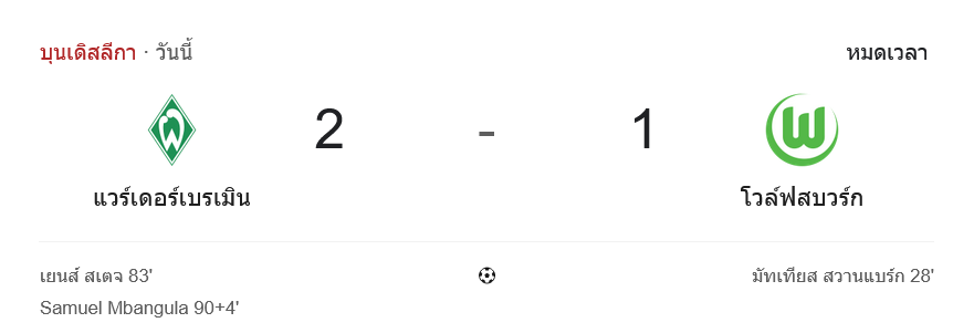 และในช่วงทดเวลาบาดเจ็บนาทีที่ 90+4 ดราม่ามาเต็ม เมื่อ ซามูเอล เอ็มบังกูล่า ตัวสำรองที่เพิ่งลงมาได้บอลจาก โอกอน โบนิแฟซ ก่อนซัดเสียบเสาให้เบรเมนพลิกนำ 2-1 แบบสุดมันส์ จบเกม เบรเมนเฉือนโวล์ฟสบวร์ก ไปอย่างสะใจแฟนเจ้าถิ่น