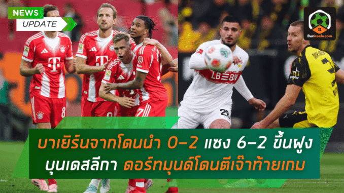 ศึก บุนเดสลีกา คืนวันเสาร์เดือดแบบแฟนบอลแทบลุกจากเก้าอี้ เมื่อ บาเยิร์น มิวนิค โดนยิงนำ 0-2 แบบช็อตไปทั้งอัลลิอันซ์ แต่ความเป็น “เสือใต้” ไม่เคยจาง หวดคืนทีเดียว 6 ประตู ไล่ถล่ม ไฟร์บวร์ก 6-2 พร้อมยึดจ่าฝูงสุดมั่นใจ ก่อนเตรียมเผชิญศึกใหญ่กับ อาร์เซน่อล ในเวที ยูฟ่า แชมเปียนส์ลีก ส่วนอีกสนาม โบรุสเซีย ดอร์ทมุนด์ ทำสาวก “เหลือง-ดำ” ใจสลาย โดน สตุ๊ตการ์ท ไล่ตีเสมอช่วงทดเจ็บแบบเจ็บลึก 3-3 ทำแต้มสำคัญหลุดมืออย่างน่าเสียดาย