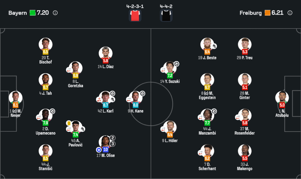 มองในเชิงแท็กติก เกมนี้คือหนังคนละม้วนระหว่างก่อนและหลังนาที 25 บาเยิร์นยืนระบบ 4-2-3-1 แบบชัดเจน ใช้คู่มิดฟิลด์ตัวรับคอยคุมโซนหน้าแผงแบ็ก แล้วให้ คาร์ล กับ โอลีเซ่ สลับตำแหน่งสร้างความปั่นป่วนในครึ่งช่อง (half-space) ทุกครั้งที่ทีมเร่งเกมรุก ทั้งเคนและโอลีเซ่จะหุบเข้ากลาง ดึงเซ็นเตอร์ของไฟร์บวร์กหลุดตำแหน่ง เปิดพื้นที่ให้ฟูลแบ็กเติม