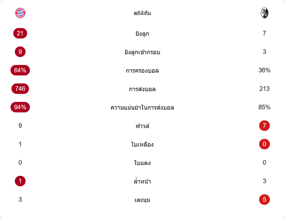 ตัวเลขหลังเกมตอกย้ำความเหนือชั้นของเจ้าบ้านชัดเจน บาเยิร์นยิงรวมถึง 21 ครั้ง เข้ากรอบ 9 ครั้ง ส่วนไฟร์บวร์กมีโอกาสเพียง 7 ครั้ง เข้ากรอบ 3 ครั้ง การครองบอลเสือใต้ครองที่ราว 64% ต่อ 36% แจกจ่ายบอลไปถึง 746 ครั้ง ด้วยความแม่นยำระดับ 94% ในขณะที่ทีมเยือนผ่านบอลเพียง 213 ครั้ง ความแม่นยำ 85% เท่านั้น แสดงให้เห็นว่าแทบไม่ได้ครองบอลนานๆ เลย