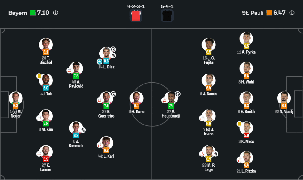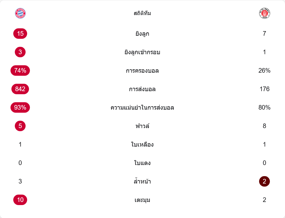 ตัวเลขหลังเกมบอกทุกอย่าง บาเยิร์นครองบอลถึง 74% ต่อ 26% ของซังค์ เพาลี ส่งบอลมากถึง 842 ครั้ง ความแม่นยำสูงถึง 93% ขณะที่ทีมเยือนจ่ายบอลได้เพียง 176 ครั้ง แม่นยำ 80% แปลว่าทั้งเกมต้องวิ่งไล่ตามลูกและแทบไม่ได้ตั้งเกมของตัวเอง