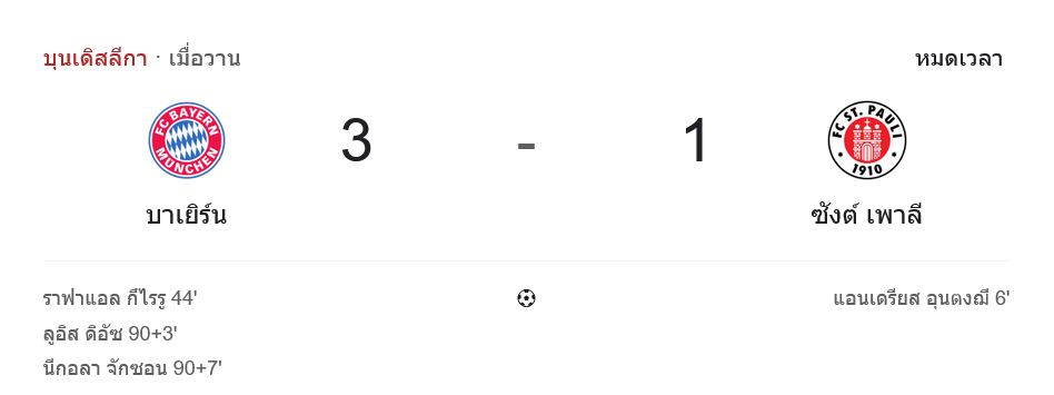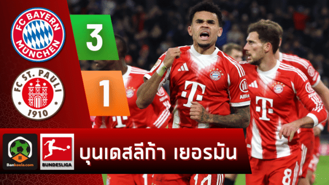 ศึกบุนเดสลีกาที่อัลลิอันซ์ อารีน่า บาเยิร์น มิวนิค โชว์ความเป็นทีมใหญ่แบบเต็มสูบ แซงชนะ ซังค์ เพาลี 3-1 ทั้งที่โดนนำตั้งแต่ต้นเกม จาก ผลบอลสด คู่นี้ “เสือใต้” ได้ประตูจาก ราฟาเอล เกร์เรยโร่, หลุยส์ ดิอาซ และนิโกลัส แจ็คสัน ขณะที่ทีมเยือนยิงนำก่อนจาก มานูเอล พี. ลาเค่ แต่สุดท้ายต้านความคมและแรงกดดันไม่ไหว กลับบ้านมือเปล่า