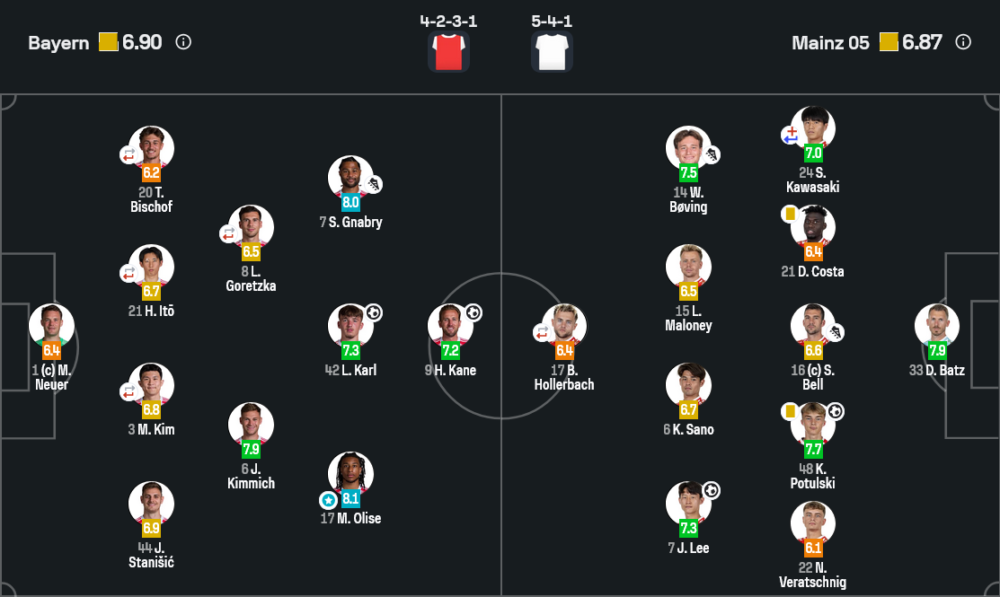 ผู้เล่นยอดเยี่ยมของเกมนี้คือ มิคาเอล โอลิส ปีกฝรั่งเศสของบาเยิร์น ที่ได้เรตติ้งสูงถึง 8.1 ตลอดทั้งเกมเขาคือจุดแตกต่างในเกมรุกของเสือใต้ เลี้ยงกินตัวคู่แข่งได้ต่อเนื่อง ดึงตัวประกบสองคนเปิดพื้นที่ให้เพื่อนเล่นง่ายขึ้น สร้างโอกาสยิงและโอกาสทำประตูหลายครั้ง ทั้งยังช่วยไล่บีบคืนบอลทันทีที่ทีมเสียการครองบอล แม้จะไม่มีชื่อบนสกอร์บอร์ด แต่พลังสร้างสรรค์ของโอลิสคือเหตุผลสำคัญที่ทำให้บาเยิร์นบุกกดไมนซ์จนแทบโงหัวไม่ขึ้นตลอดทั้ง 90 นาที