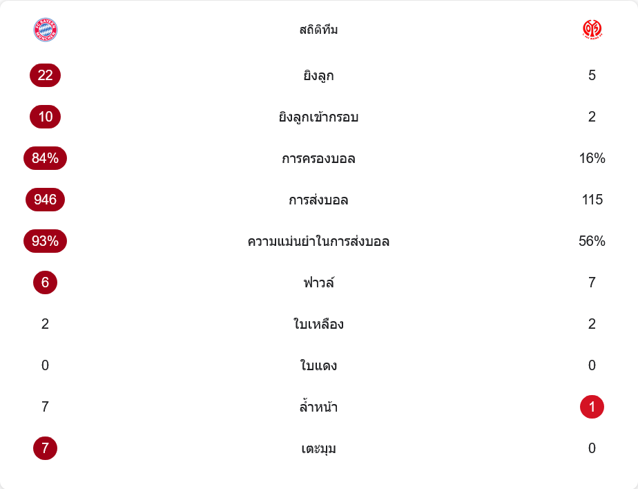 ตัวเลขหลังเกมบอกเรื่องราวได้ชัดเจน บาเยิร์นครองบอลถึง 84% เทียบกับไมนซ์ที่มีเพียง 16% เท่านั้น เสือใต้ยิงทั้งหมด 22 ครั้ง เข้ากรอบ 10 ครั้ง ขณะที่ทีมเยือนยิงเพียง 5 ครั้ง เข้ากรอบ 2 ครั้งแต่กลายเป็น 2 ประตูเต็มๆ เสือใต้ต่อบอลรวม 946 ครั้งด้วยความแม่นยำสูงถึง 93% แสดงให้เห็นถึงความเหนือชั้นด้านการคุมจังหวะ แต่กลับไม่สามารถเปลี่ยนความได้เปรียบให้กลายเป็นชัยชนะได้