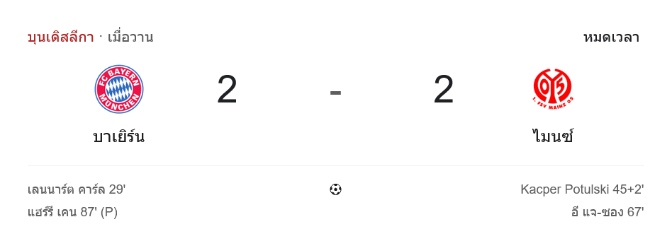 - ⏱ นาที 90+7: จบเกมหลังทดเวลา 7 นาที บาเยิร์น มิวนิค เสมอ ไมนซ์ 05 2-2 แบ่งกันไปทีมละหนึ่งแต้ม