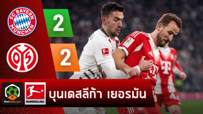 ศึก บุนเดสลีกา ที่อัลลิอันซ์ อารีน่า บ้านของบาเยิร์น มิวนิค กลายเป็นค่ำคืนแห่งดราม่าสุดเดือด เมื่อแชมป์เก่าโดนทีมบ๊วยอย่างไมนซ์ 05 บุกมาเขย่าบัลลังก์จนต้องไล่ตามตีเสมอแบบหืดจับ 2-2 จากจุดโทษปลายเกมของ แฮร์รี เคน เกมนี้แฟนบอลที่กดเช็ก ผลบอลสด กันแบบวินาทีต่อวินาทีน่าจะหัวใจกระตุกไปตามจังหวะขึ้นนำ–โดนนำ–ไล่เจ๊า ชนิดลุ้นกันจนถึงเวลาทดเจ็บนาทีที่ 97