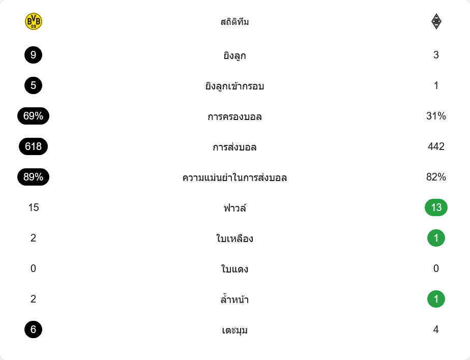 สถิติสำคัญบอกชัดว่าเกมนี้เป็นของเจ้าบ้านแบบเบ็ดเสร็จ ดอร์ทมุนด์ยิงทั้งหมด 9 ครั้ง เข้ากรอบ 5 ครั้ง ส่วนกลัดบัคมีโอกาสยิงเพียง 3 ครั้ง เข้ากรอบแค่ 1 ดอร์ทมุนด์ครองบอลมากถึง 69% จากจำนวนการจ่ายบอล 618 ครั้ง ความแม่นยำสูงถึง 89% ขณะที่กลัดบัคครองบอลเพียง 31% จ่าย 442 ครั้ง ความแม่นยำ 82% เกมนี้มีการปะทะกันหนักพอสมควร ฟาวล์ฝั่งเจ้าบ้าน 15 ครั้ง ทีมเยือน 13 ครั้ง ใบเหลืองฝั่งเสือเหลือง 2 ใบ จาก ชาน และ ชลอตเตอแบ็ค ส่วนกลัดบัคได้ใบเหลืองใบเดียวเป็นของ เนิทซ์ ตัวเลขล้ำหน้า 2-1 และเตะมุม 6-4 ยิ่งตอกย้ำว่าดอร์ทมุนด์บุกแล้วบุกอีกตลอด 90 นาที