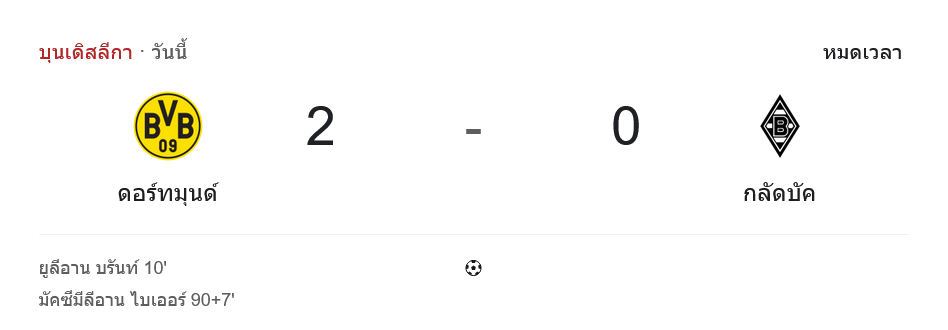 - ⚽ นาที 10 ดอร์ทมุนด์ขึ้นนำ 1-0 ยูเลียน แบรนท์ ซัดประตูจากการจ่ายของ นิคเลาส์ ซือเล่