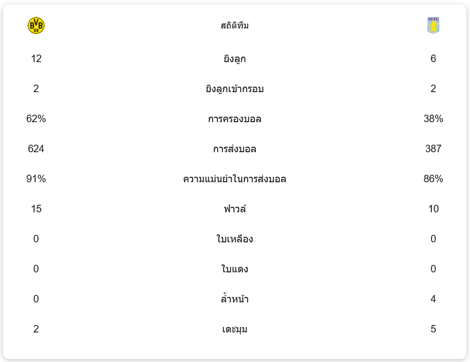 ด้านทีมแอสตัน วิลล่ามีการยิงทั้งหมด 6 ครั้ง ยิงเข้ากรอบ 2 ครั้ง ครองบอลได้ 38% การทำฟาวล์ทั้งหมด 10 ครั้ง ไม่มีใบเหลืองหรือใบแดง ได้เตะมุม 5 ครั้ง และล้ำหน้า 4 ครั้ง