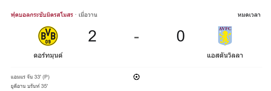 สรุปผลและผลกระทบต่อทีม ชัยชนะในนัดนี้ช่วยให้ โบรุสเซีย ดอร์ทมุนด์ สร้างความมั่นใจในการเตรียมตัวเข้าสู่ฤดูกาลใหม่ ขณะที่ แอสตัน วิลล่า ต้องกลับไปปรับปรุงฟอร์มการเล่นก่อนการแข่งขันฤดูกาลที่กำลังจะมาถึง การแข่งขันนัดนี้แสดงให้เห็นถึงความแข็งแกร่งของทีมโบรุสเซีย ดอร์ทมุนด์ในการควบคุมเกมและความแม่นยำในการส่งบอล