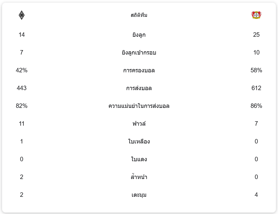 - จำนวนการส่งบอล: โบรุสเซีย มึนเช่นกลัดบัค 443 ครั้ง (ความแม่นยำ 82%), ไบเออร์ เลเวอร์คูเซิน 612 ครั้ง (ความแม่นยำ 86%)
